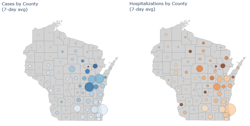 The northeast is still the state’s hotspot. Brown (Green Bay), Outagamie (Appleton) and Winnebago (Oshkosh) counties all have high numbers of cases and hospitalizations. Some smaller counties in the vicinity, such as Shawano, Oconto, and Menominee, have even worse numbers on a per-population basis.